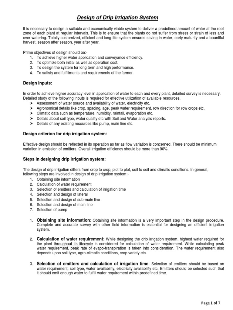 Drip irrigation system design calculations pdf. A drip irrigation system comprises many components each one of them playing an important part in the operation of the system. Agricultural Crops is undertaken with following objective- To simplify the calculations of design of drip irrigation system using C language. Structure of the drip irrigation system System head.